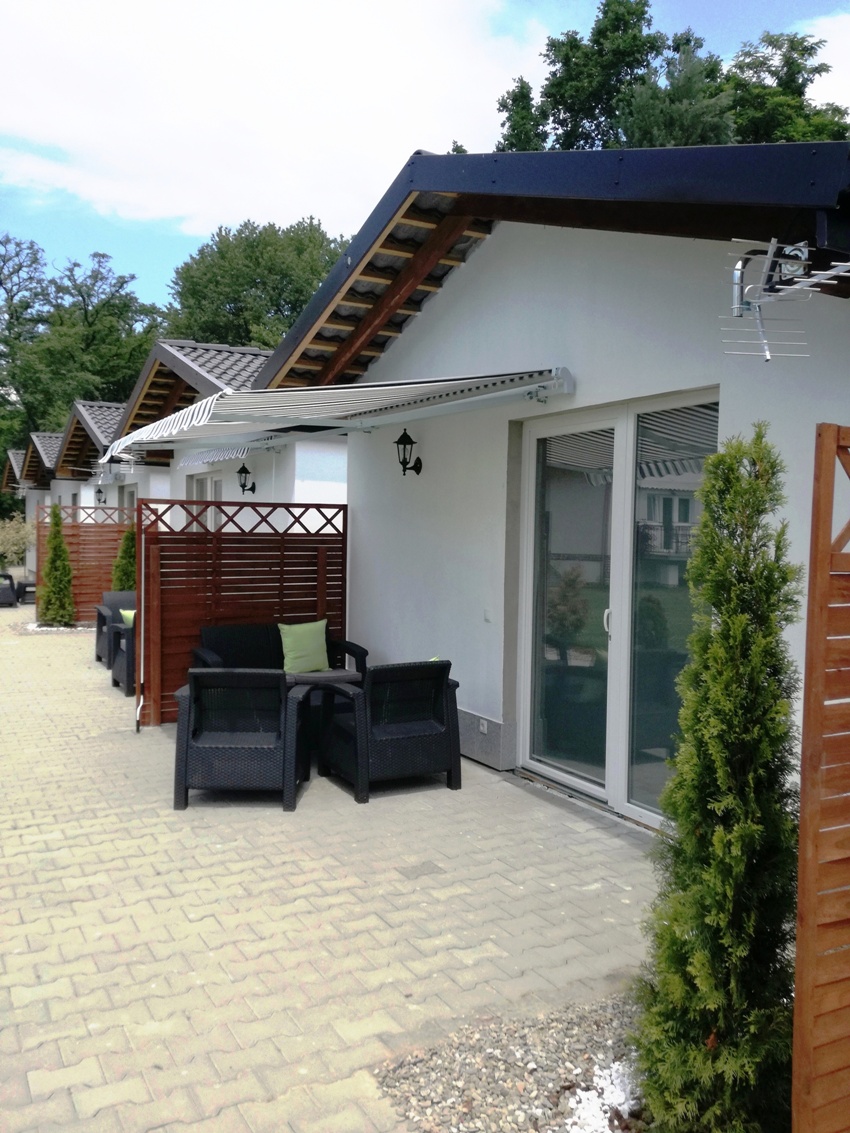 Złącze internetowe (WiFi) , Telewizję , Taras z markizą oraz meblami wypoczynkowymi (2 ławki i stół) , komplety kołder i bielizny pościelowej dla gości.